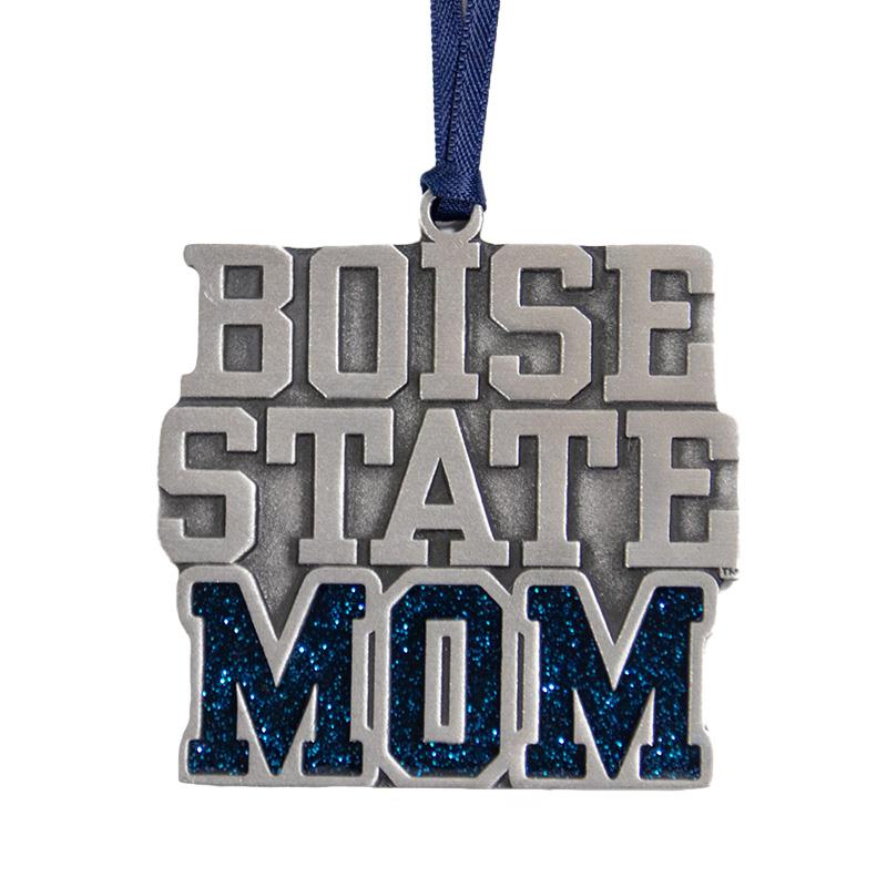 Boise State University Ornament - Mom Wordmark Pewter with Blue Glitter, Logo on Back by RFSJ