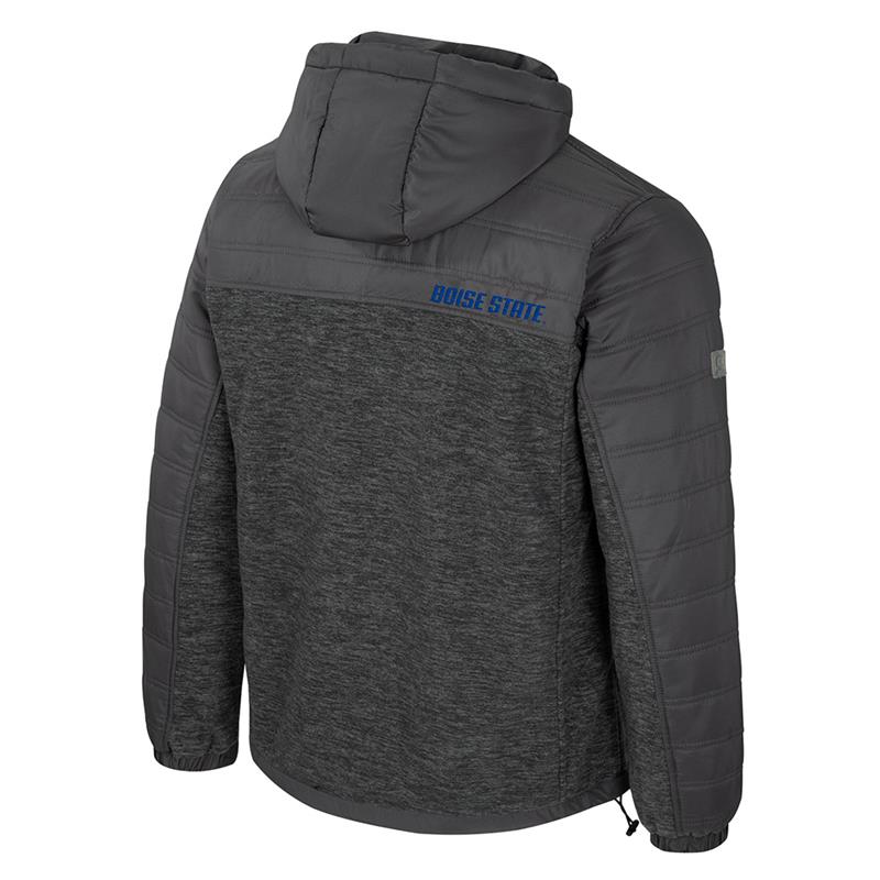 Warm without the bulk. This Colosseum hooded puffer combines a quilted shell with soft heather panels, finished with an embroidered Bronco Head at the chest and a Boise State wordmark across the back.