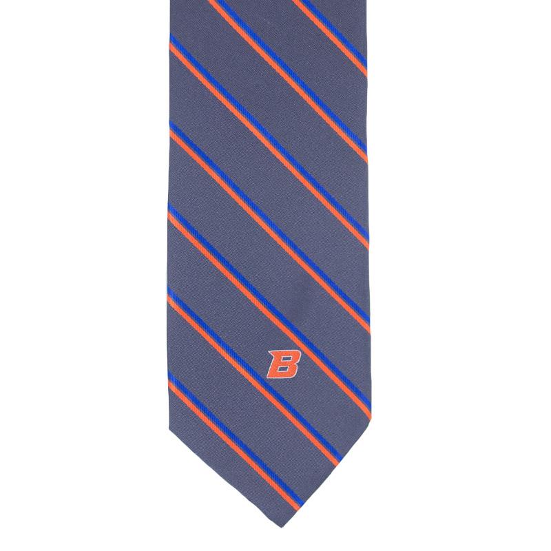 Show your school colors with this refined silk tie from Donegal Bay. Alternating orange and royal diagonal stripes sit on a charcoal ground, finished with the classic Boise State “B” logo near the tip.