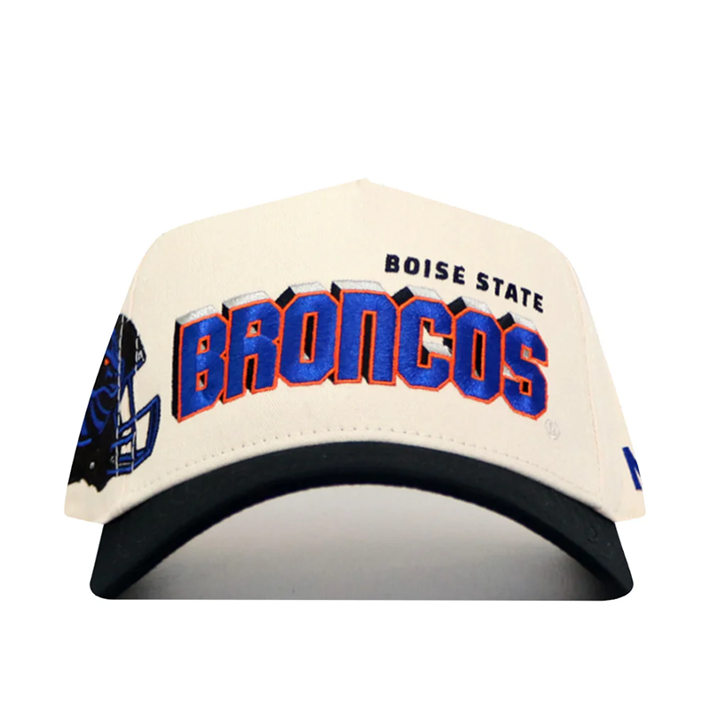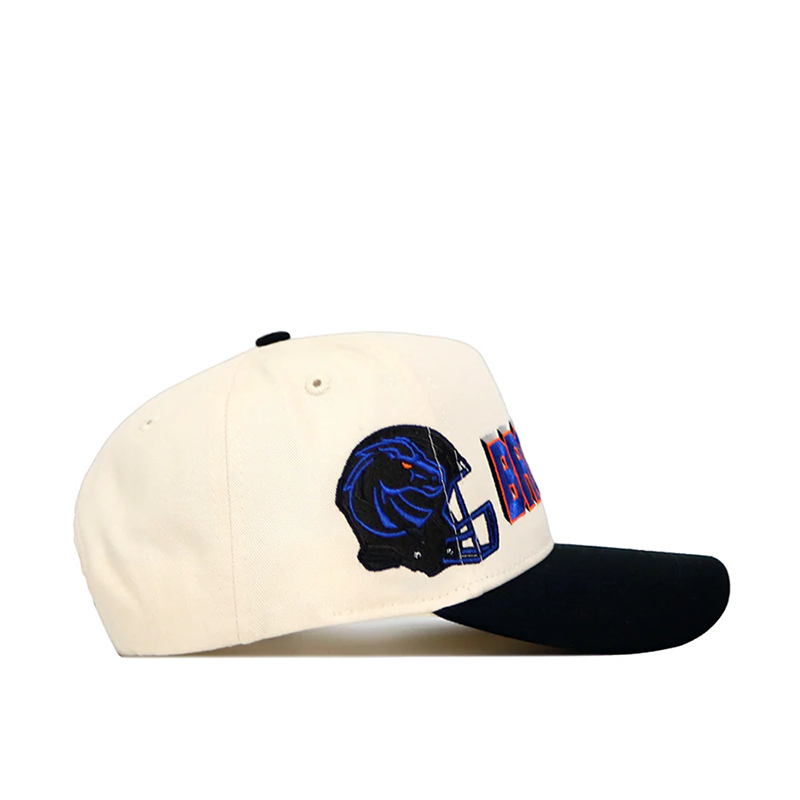 Show your Bronco pride in this vintage-inspired cap from No Rivals. The cream crown pairs with a contrast bill and bold BRONCOS wordmark up front, while an embroidered Boise State helmet rides the left side for extra game-day swagger. Structured for shape, comfy for daily wear, and finished with an easy snapback closure.